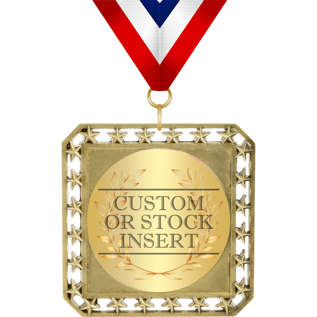 This versatile 3.5" medal can be used as either a diamond or square shaped medal. Available in Gold, Silver or Bronze. Shown with a 2" round insert.